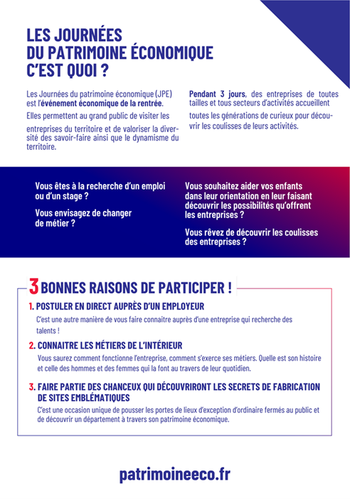 📅 Du 26 au 28 septembre, comme pour les Journées du Patrimoine, ouvrez les portes des entreprises près de chez vous et découvrez des lieux et métiers habituellement fermés au public.
